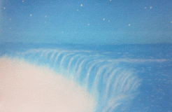 この絵はアメリカの岩山を描きました。 他の絵もそうなのですが空に★が一つというのは 「到達するべき目標」という意味で描いていますが昼の月でも太陽でも良いです。 実際には昼の月も太陽もこのくらいの大きさに見えますね。 絵の持ち主の受け取り方によってどうにでも感じてください。 |