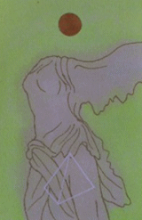 | <サモトラケのニケ>(2012年1月25日) 「Viva!(ビバ!)」のぱとりさんから8枚目の絵の依頼がありました。 普段占いを無料でやってもらっているし、サービスしようと思ったのですが・・・ 一枚失敗してしまった。 その絵は「金運up」の絵でサモトラケのニケ(若い女性に描いてます)で 発想は独特だし色使いも個性的で良いのだが、 左下に描いたピラミッドの頂点と左上の◎の中心がズレてしまい 私としては気持ち悪い出来となってしまったのでした。 なのでいったん絵を発送してから新たにサモトラケのニケを描きました。 一枚目の絵と同じ構図にするはずでしたが何故か全然違う絵になってしまった。