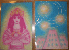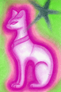 | <バステト>(2008年1月24日) 絵の鑑定でお世話になっているレインボーさんから絵の依頼がありました。 守護存在ということで、さて、何を描こうかと思ったらネコが浮かんだ。 でも、なんだかなぁと思ったので、女性の顔にしました。 守護存在の女性の絵は、自分によく似ていました。 今年の夏は暑かったので、絵の女性のような髪型にしていたんです。 あと絵の裏に「他にもいますが、とりあえず一番バッターで登場」と あったので、心強く思いました。他にもどんな存在がいるのか 興味津々です。また折に触れ、絵をお願いしたいと思います。 また時間ができたら自分の絵も鑑定してみたいと思います。 ところが絵を送った後で(やっぱりネコを描けば良かった)という思いがする。 ネコというのはバステトです。 バステトを描けば良かった、でも、もう送っちゃったよ、でも 浮かんだのだから描かなくちゃ・・・と数日間思い続けて、 やはり他の絵を描くついでに描いて送りました。 こんばんわ。crystal-rainbowです。 ![]() 本日「バステト☆」の絵が届きました。 追加で絵を描いてくださったとは つゆ知らず 驚き&感激でした!!! ありがとうございます☆ お代の方はよろしいのでしょうか??? これは前回の絵と一緒に 送るべきだったのでタダです。 私がさっさと描けば良かったんです。 この絵の猫なのですが、 実家で白猫を飼っているのですが 先代の白猫に雰囲気がそっくりで 驚いています。 へええ! 実はウチにあるエジプトみやげのバステトの小像を写生したんです。 でも、本ものは黒い。 でも、絵のネコは白にしました。 なんでだか白猫になってしまった。 ではレインボーさんの家のネコちゃんが登場したのかな? (ちなみに今の猫は2代目なのですが、 同じ白猫なのに似てません。めっちゃ不思議です!) すごく賢く温厚な猫で、良くなついていて可愛かったんです。 もしかして昔から縁が深い猫だったのかなぁ〜と思ったりしてます。 そして右上のシルバーの☆が意味ありげですね。 他の絵と一緒にリーディングするのが楽しみです。 とってもうれしかったです♪ありがとうございました! また何か感じたことがあれば、ご連絡いたしますね! crystal-rainbow ぜひリーディング結果を送ってね。 先日送っていただいた「バステト☆」の鑑定結果が 出来上がりましたので、早速お送りしたいと思います。 自分の絵の鑑定なので、表現が少々ぎこちない感じもしますが(涙) あはh。 タイトル:「バステト☆」 バステトはエジプトの女神の1人で、猫の神様と言われています。元 来のバステト神というのは「バストの街の者」と言う意味で、バスト地 方の神様だったようです。今ではバステトは音楽の神であったり、猫は 多産の為、子供を産み育てる母としての女神、また出産の守護神とも言 われているようです。 そうなんだ、知らなかった。 ただネコの神だと思ってました。 この絵は「調和」や「自由」を意味しており、心の中の安らぎや愛、 自己表現の自由などを表し、またそれをサポートしているようですよう です。バステトは神話の中で荒ぶる雌獅子としてセクメトと同一視され ることも多いのですが、おとなしい家猫を表す場合には猫の女神である バステト神として使い分けがされています。この絵はまさに家猫的な自 由で穏和で癒しを与えるといった部分を強調しています。 このバステトの絵の右上の銀の星はシリウスだと思われます。詳しい ことは分かりませんが、調べた限りではバステト神とシリウスの繋がり はさほどなさそうです。バステト神と共に、シリウスからのサポートも あるということを意味しているようです。 実はエジプトみやげにアヌビス神像も買ってきたんです。 おみやげを沢山買って皆さんに分けたいと思ってたのに 全然買い物する時間がなかったんです。 1時間くらいしかなくて商品には定価がついてない。 で、交渉するわけですよ。 言葉が通じないのに! やっと像を二つ買えたんだけど、それが「バステト」と「アヌビス」です。 この二つを枕元に並べています。 まぁ、人間の形をした神より動物神の方が好き。 (こんなところも元素霊っぽい私です) それはともかく実はアヌビス神=シリウスなんです。 我が家のアヌビス神が「ボクも」と言って絵に登場したのかな? この絵からのメッセージは「もっと瞑想を」ということでした。瞑想 を通して、守護してくださっているバステト神からやシリウスからのメ ッセージを明確に受け取るように、とのことだと思います。 おお・・・ ☆鑑定の感想など まず鑑定をしていて驚いたのが、バステトが出産の守護神だったとい うことです。出産を3月末に控えた私にはとても心強い神様の登場で感 激&シンクロに驚きです!3歳になる宇宙人(息子)相手に、大きくなっ たお腹で格闘している毎日なので、この絵を見ると癒されるようで、心 がほっこりします♪ なるほど!安産の神ね。日本では安産のお守りは犬なんだけどね。 そして先日の
