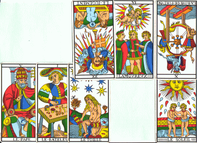 審判の下に法王と手品師と星のカードが向き合っているので、
